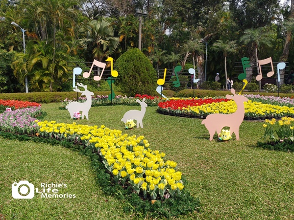 水池旁的鬱金香花盆,大家圍著它拍得不亦樂乎